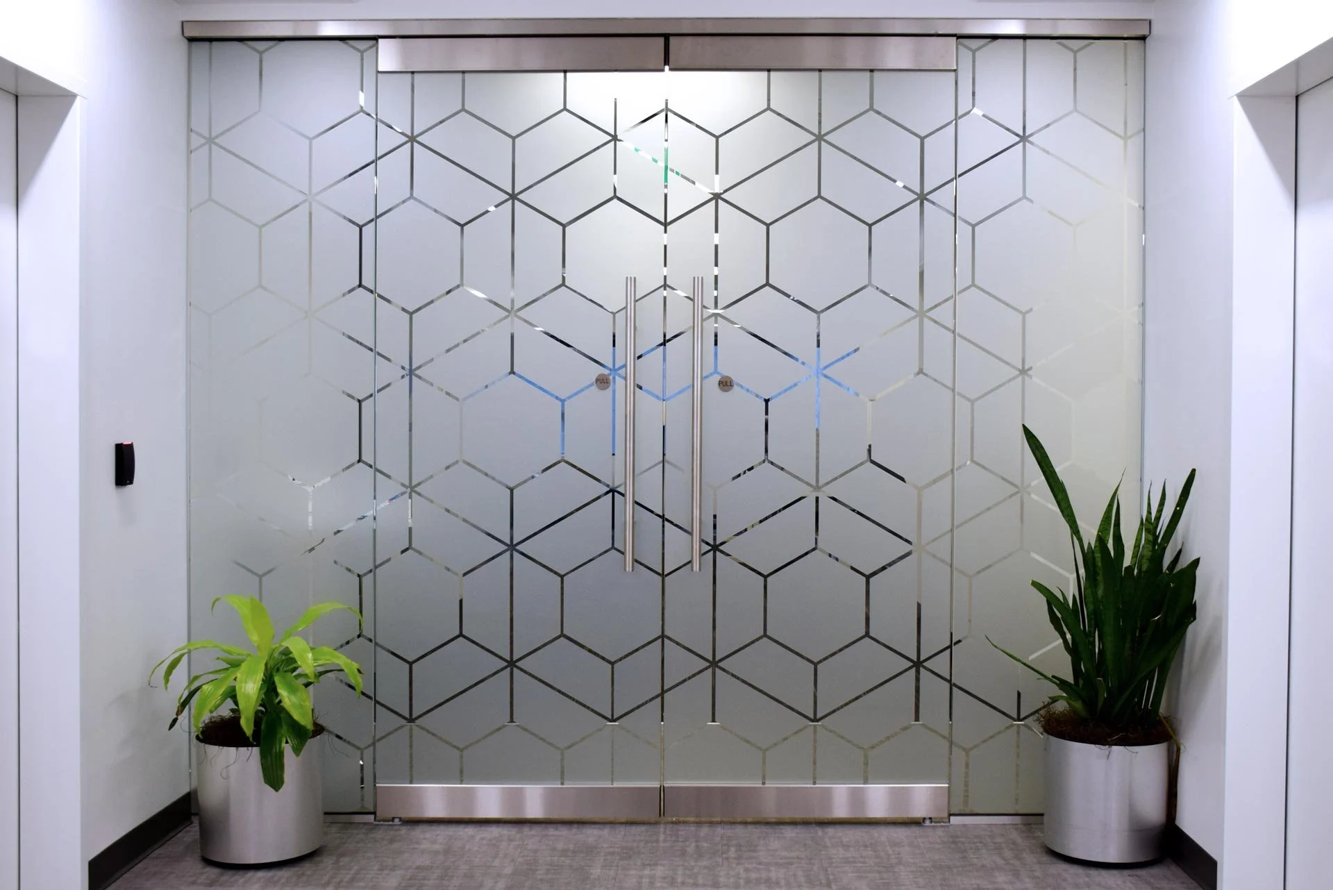 Reception. Frosted vinyl privacy film design (right rear) by me, desk and geometric backdrop design by interior designer Christine Chaney.
